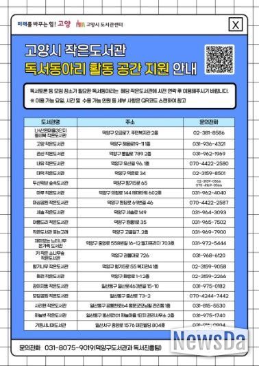 뉴스다 최광묵 기자 | 고양특례시는 시민들의 독서 문화를 확산하고 독서동아리 운영을 활성화하기 위해 공사립 작은도서관을 독서동아리의 모임 장소로 지원한다고 24일 밝혔다.