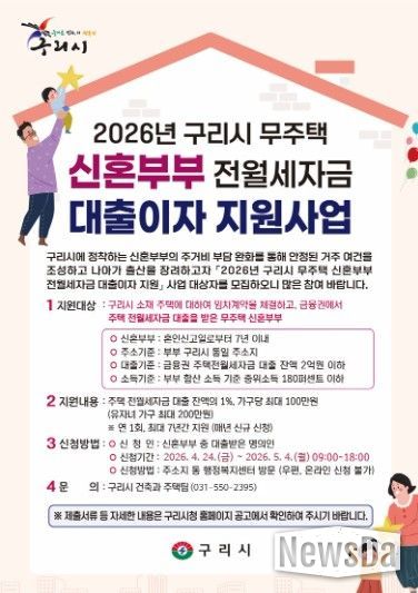 뉴스다 최광묵 기자 | 구리시는 관내 무주택 신혼부부의 주거비 부담을 완화하고 저출생 문제 극복에 이바지하기 위해 ‘2026년 2차 무주택 신혼부부 전월세 자금 대출이자 지원사업’을 오는 4월 24일부터 시행한다고 밝혔다.