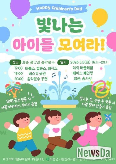 뉴스다 최광묵 기자 | 화순군은 오는 5월 5일 오후 4시부터 밤 8시까지 꽃강길 음악분수대에서 어린이날 특별 행사 ‘빛나는 아이들 모여라’를 개최한다고 밝혔다.
