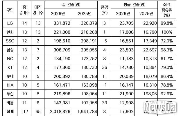 뉴스다 류대현 기자 | 2026 신한 SOL KBO 리그가 오늘(25일) 열린 잠실, 문학, 광주, 고척, 대전 경기에서 총 9만 9,905명이 입장하며 200만 관중을 달성했다.