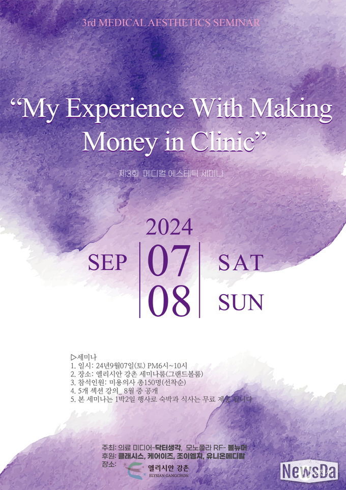 먼저 '3rd MEDICAL AESTHETICS SEMINAR’는 'My Experience With Making Money in Clinic’을 주제로 열리며, 9월 7일(토) 오후 6시부터 10시까지 엘리시안 강촌 세미나룸 그랜드볼룸에서 미용의사 총 150명이 참석할 예정이다.