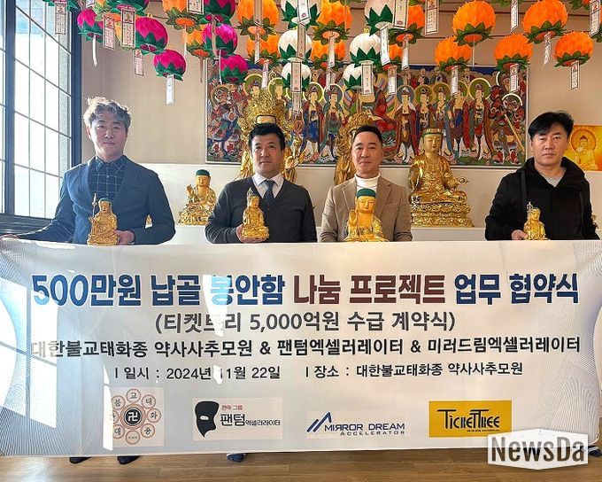 뉴스다 최광묵 기자 | 대한불교 태화종(종정 청덕 스님)은 종단에서 운영하는 약사사봉안당(대표 윤종윤)의 개인 불상 봉안함(500만원), 부부 불상 봉안함(800만원)에 대해서 팬텀엑셀러레이터(대표 엑셀러레이터 김세훈, 파트너 엑셀러레이터 변호사 이기영)&미러드림엑셀러레이터(대표 김호석)와 나눔 프로젝트를 진행한다. 이에 지난 22일 문경 약사사봉안당에서 티켓트리 운영사인 팬텀엑셀러레이터와 모바일상품권 티켓트리 5,000억원 수급 계약을 체결했다고 밝혔다.