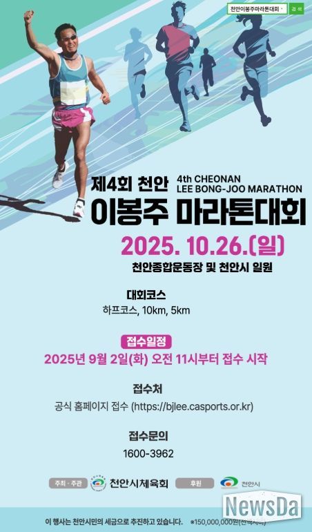 뉴스다 류대현 기자 | 천안시체육회는 ‘제4회 천안이봉주마라톤대회’ 참가자를 다음 달 2일부터 선착순 모집한다고 25일 밝혔다.