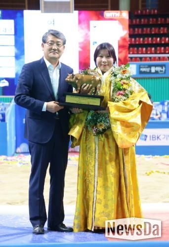 김다영 선수는 지난해 같은 대회 8강에서 탈락했으나, 올해 결승에서 충북 영동군청 소속 양윤서(국화급) 선수를 꺾고 생애 첫 천하장사 타이틀을 거머쥐었다.