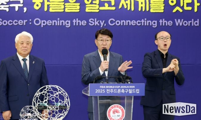 대회 공동 조직위원장을 맡은 우범기 전주시장과 김정태 전주상공회의소 회장은 27일 시청 4층 회의실에서 오는 9월 25일부터 28일까지 4일간 전주월드컵경기장 일원에서 32개국 2700여 명의 선수단이 참가한 가운데 펼쳐지는 ‘2025 전주드론축구월드컵(FIDA World Cup Jeonju 2025)’의 주요 일정과 준비 사항을 발표했다.
