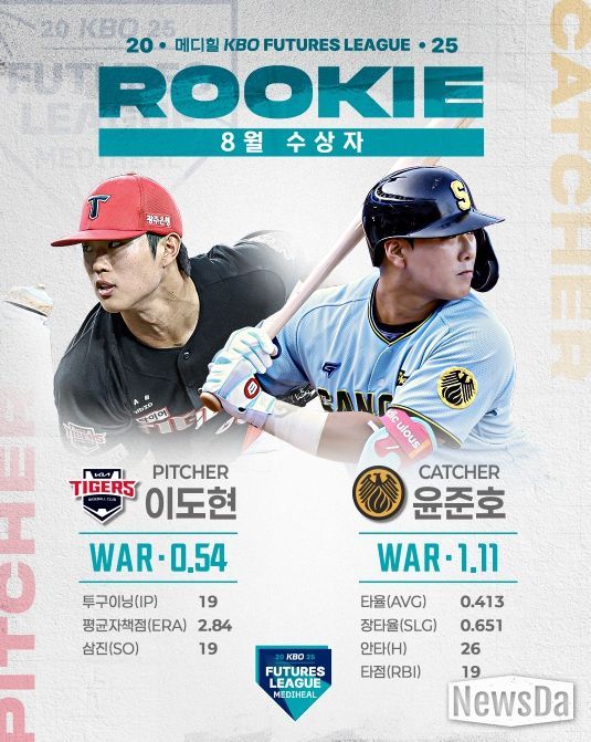 뉴스다 류대현 기자 | 2025 메디힐 KBO 퓨처스리그의 8월 퓨처스 루키상 수상자로 투수 부문에는 KIA 이도현이 WAR 0.54, 타자 부문에는 상무 윤준호가 WAR 1.11을 기록하며 각각 선정됐다.