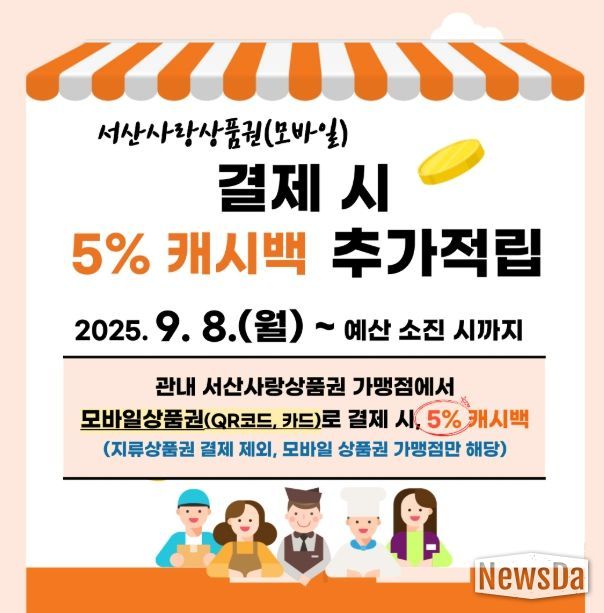 뉴스다 최광묵 기자 | 충남 서산시는 오는 9월 8일부터 지역사랑상품권으로 물건을 구매하면 5%의 캐시백 혜택이 적용된다고 밝혔다.