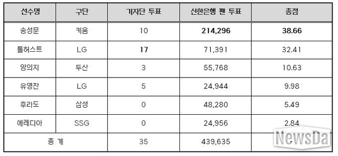 송성문은 기자단 투표 총 35표 중 10표(28.6%), 팬 투표 43만 9,635표 중 21만 4,296 표(48.7%)로 총점 38.66점을 받아, 기자단 투표 17표, 팬 투표 7만 1,391표로 총점 32.41점을 기록한 LG 톨허스트를 제쳤다.