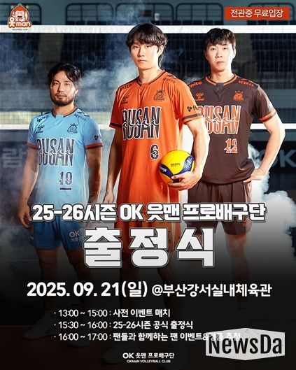 뉴스다 류대현 기자 | 부산시는 오는 9월 21일 오후 1시 강서체육공원 실내체육관에서 오케이(OK)저축은행 읏맨 프로 배구단(구단주 최윤)의 '2025-26시즌 출정식'이 개최된다고 밝혔다.