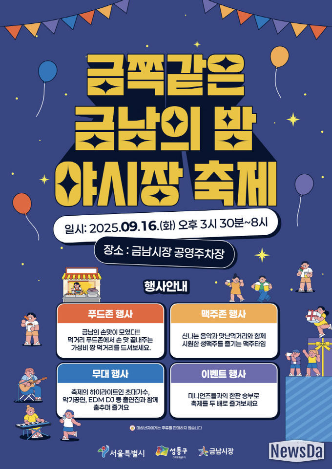 뉴스다 최광묵 기자 | 서울 성동구 금남시장이 2025년 9월 16일(화) 오후 3시 30분부터 8시까지 특별한 가을밤 축제의 장으로 변신한다.