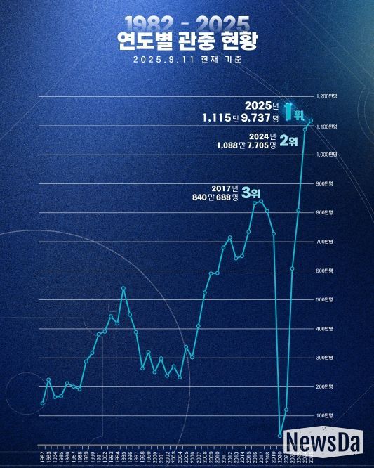 KBO 리그는 출범 첫 해인 1982년부터 지난 해까지 치러진 정규시즌 2만 2,860경기에서 누적 1억 8천 884만 1,044명으로 2억 관중 달성까지 1천115만 8,956명을 남겨두고 2025 시즌을 맞이했다. 어제 9월 11일(목)까지 1천115만9,737명의 관중이 입장하며 정규시즌 누적 2억 781명을 기록했다
