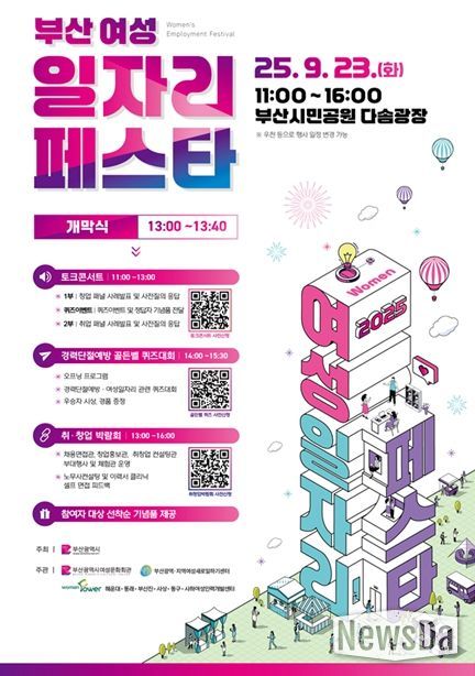 뉴스다 최광묵 기자 | 부산시는 오는 9월 23일 오전 11시부터 오후 4시까지 부산시민공원 다솜마당에서 '2025 부산 여성 일자리 페스타'를 개최한다고 밝혔다.
