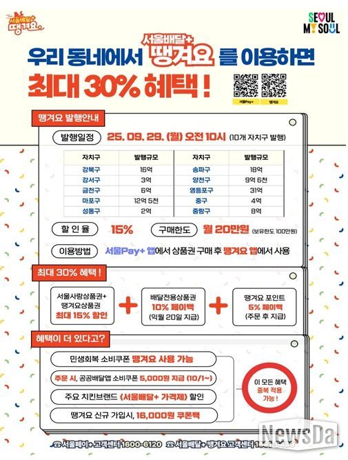' 29일(월)부터 ‘자치구 배달전용상품권’ 110억 규모 발행… ‘서울페이+’ 앱에서 15% 할인 판매'