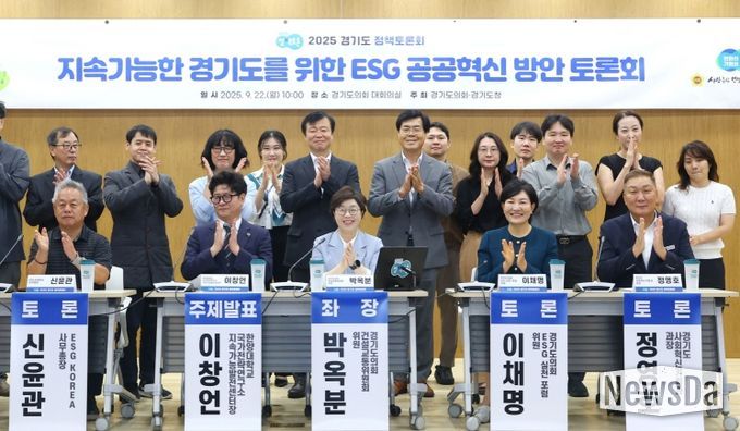 뉴스다 최광묵 기자 | 경기도의회 건설교통위원회 박옥분 의원(더불어민주당, 수원2)이 좌장을 맡은 '지속가능한 경기도를 위한 ESG 공공혁신 방안 정책토론회'가 9월 22일 경기도의회 대회의실에서 개최됐다. 본 토론회는 경기도와 경기도의회가 공동으로 주최하는 ‘2025 경기도 정책토론회’의 일환으로 개최됐다.