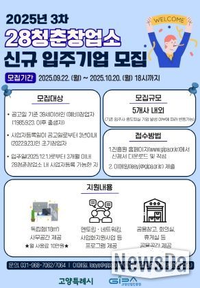 뉴스다 최광묵 기자 | 고양특례시가 조성하고 고양산업진흥원이 운영하는 ‘28청춘창업소’가 10월 20일까지 3차 신규 입주기업을 모집한다.