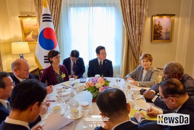 뉴스다 최광묵 기자 | 유엔총회 참석 차 미국을 방문한 이재명 대통령이 22일(현지시간) 오후 뉴욕에서 미 상원 외교위 및 하원 외무위 소속 의원 4명을 접견하고, 한미동맹 강화, 한미 경제협력 확대 및 한반도 문제 등에 대해 의견을 교환했다.