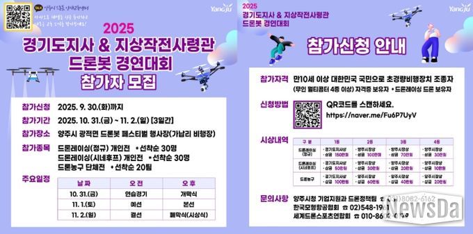 뉴스다 최광묵 기자 | 양주시가 '2025 경기도지사ㆍ지상작전사령관배 드론봇 경연대회'에 참가할 일반부 선수를 오는 9월 30일까지 모집한다.