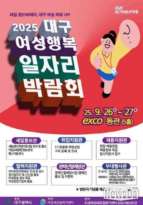 뉴스다 최광묵 기자 | 대구광역시는 여성들의 다양한 취·창업 기회를 지원하고, 경력단절 여성의 사회 복귀를 돕기 위해 ‘2025 대구 여성행복 일자리박람회’를 오는 9월 26일부터 27일까지 양일간 엑스코 동관(전시 5홀)에서 개최한다.