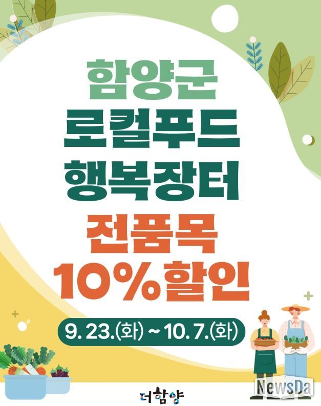 뉴스다 최광묵 기자 | 함양군은 9월 24일부터 10월 8일까지 2주간 로컬푸드 행복장터에서 전품목 10% 할인 행사를 실시한다고 밝혔다.
