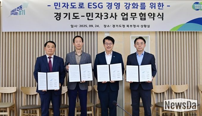뉴스다 최광묵 기자 | 경기도는 24일 경기도청 북부청사에서 경기남부도로(주), 제삼경인고속도로(주), 일산대교(주) 등 도내 민자도로 사업자 3개사와 ESG(환경·사회·투명) 경영 강화를 위한 업무협약을 체결했다.