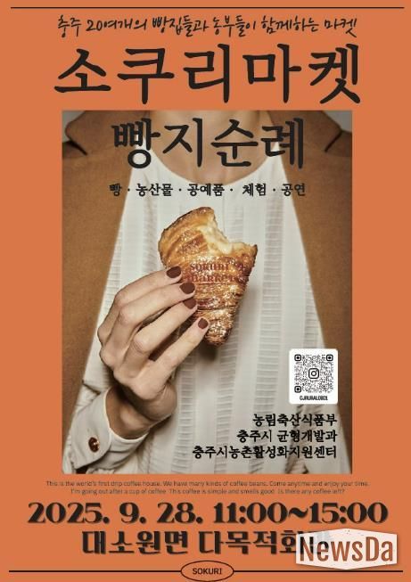 뉴스다 최광묵 기자 | 충주시농촌활성화지원센터는 오는 9월 28일 오전 11시부터 오후 3시까지 대소원면 다목적회관 광장에서 두 번째 ‘소쿠리마켓 빵지순례’를 개최한다고 밝혔다.