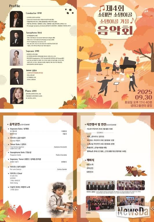 뉴스다 최광묵 기자 | 충주시 소태면 주민자치위원회은 오는 9월 30일 오후 5시 40분, ‘2025년 제4회 소탱이골 작은 음악회’를 개최한다고 밝혔다.