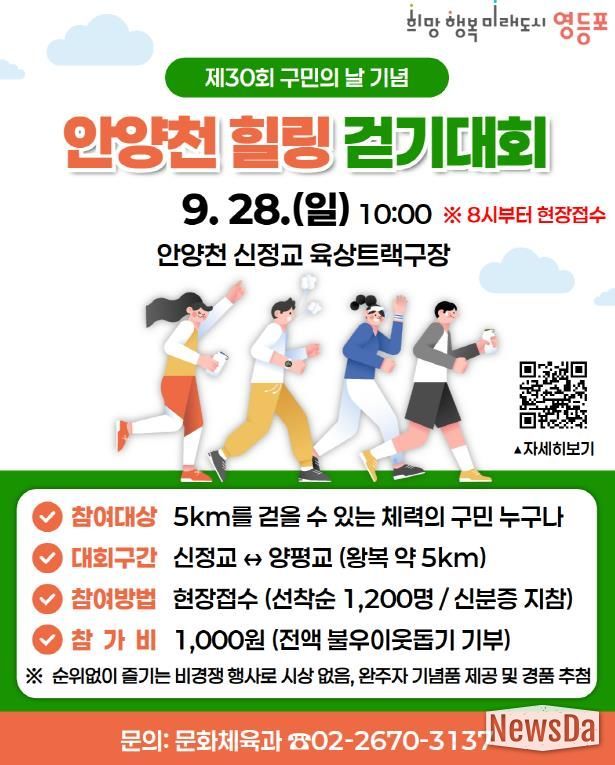 뉴스다 최광묵 기자 | 영등포구가 제30회 구민의 날을 기념해 오는 9월 28일 안양천 신정교 육상트랙구장에서 ‘안양천 힐링 걷기대회’를 개최한다고 밝혔다. 대회는 영등포구 육상연맹에서 주관하고 영등포구와 영등포구 체육회에서 후원한다.