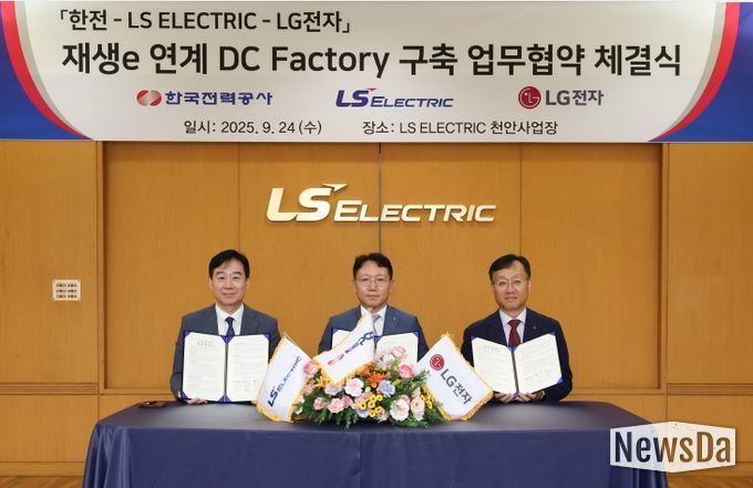 한전은 9월24일 LS ELECTRIC 천안사업장에서 LS ELECTRIC, LG전자와 ‘재생에너지 연계 DC Factory 구축’을 위한 업무협약(MOU)을 체결했다. 이번 협약은 K-DC Alliance의 핵심 실증사업이자, ‘한국형 차세대 전력망’ 구축의 일환으로 추진됐다.