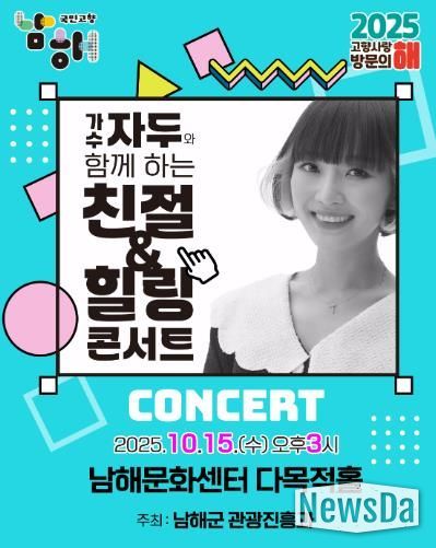 뉴스다 최광묵 기자 | 남해군은 오는 10월 15일 오후 3시, 남해문화센터 다목적홀에서 ‘가수 자두와 함께하는 친절 & 힐링 콘서트’를 개최한다.