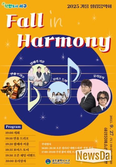 뉴스다 최광묵 기자 | 광주광역시 서구는 오는 27일 오후 7시 농성동 하정웅미술관 앞 잔디광장에서 ‘2025 가을 힐링음악회 – 폴 인 하모니(Fall in Harmony)’를 개최한다.