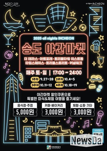 뉴스다 최광묵 기자 | 인천광역시와 인천관광공사(사장 백현)는 9월 27일부터 10월 19일까지 매주 토·일 4주간 송도 일대 6개 상권에서 풍성한 할인혜택과 더불어 상권별 다양한 행사를 즐길 수 있는‘2025 all nights INCHEON 송도 야간마켓’을 개최한다고 밝혔다.