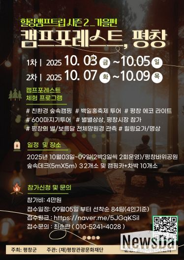 뉴스다 최광묵 기자 | 평창관광문화재단은 바위공원 힐링 프로그램 운영 사업을 통해 가을철 자연 속 힐링과 체험을 결합한 가족 단위 캠프 프로그램, '캠프포레스트, 평창'의 참가자를 모집한다. 행사는 오는 10월 3일부터 9일까지 평창군 평창읍 바위공원 일대에서 진행된다.
