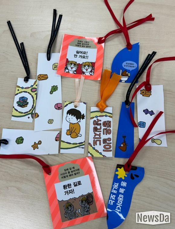 뉴스다 최광묵 기자 | 청주오창호수도서관은 25일 탄소중립 실현 및 청주시민 청렴 실천을 위해 폐지 처리 예정인 책 띠지와 커버로 업사이클링 책갈피를 자체 제작해 시민과 나눴다.