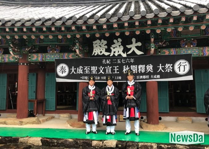 뉴스다 최광묵 기자 | 음력 8월의 상정일(上丁日)인 9월 25일(수) 거제향교(전교 김평철)에서 시민 및 유림 50여 명이 참석한 가운데 석전대제를 진행했다.