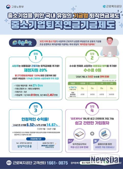 푸른씨앗의 주요 혜택은 ▲월 급여 273만원 미만 근로자에 대해 사업주와 근로자에게 부담금의 10% 지원금 지급 ▲운용수수료 전액 면제 ▲간소한 가입 절차로 사업주의 행정 부담 완화 등이 있다.