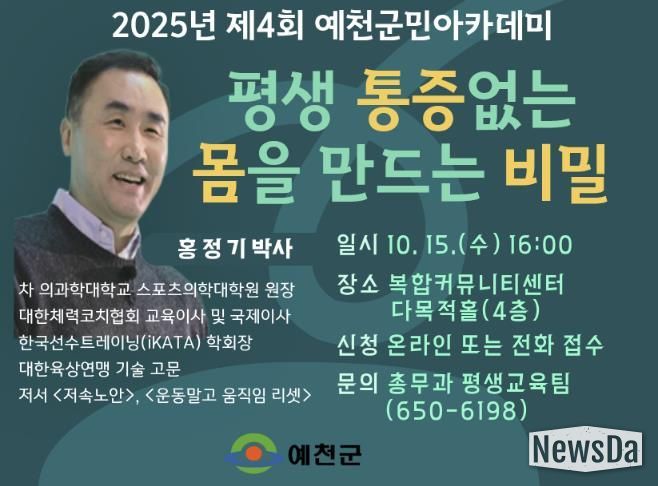 뉴스다 최광묵 기자 | 예천군은 10월 15일 오후 4시, 복합커뮤니티센터 다목적홀에서 ‘2025년 제4회 예천군민 아카데미’를 개최한다.