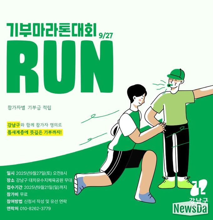 뉴스다 최광묵 기자 | 꿈이 모이는 도시, 미래를 그리는 강남구가 오는 9월 27일 오전 9시부터 오후 2시 30분까지 양재천 일대에서 ‘기부-Run 강남 달리기’ 행사를 개최한다. 이 행사는 참가자의 걸음과 달리기가 기부로 이어지는 기부 연계형 건강 캠페인으로, 건강한 나눔을 실천하는 지역사회 공헌 프로그램이다.