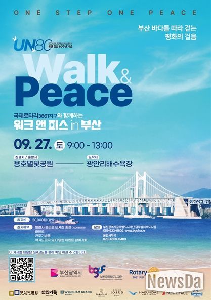 뉴스다 최광묵 기자 | 부산글로벌도시재단(전용우)은 9월 27일 09시부터 용호별빛공원에서 '국제로타리 3661지구와 함께하는 워크 앤 피스 in 부산'행사를 개최한다고 밝혔다.