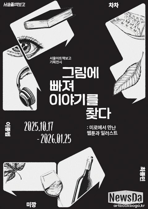 서울아트책보고에서는 10월 17일부터 내년 1월 25일까지 '그림에 빠져 이야기를 찾다 : 미로에서 만난 웹툰과 일러스트' 전시가 열린다. 미로 형태로 구성된 전시장에서 웹툰 ‘닥터 프로스트’의 이종범 작가를 비롯, 미깡, 최종민, 차차의 작품을 감상하며 관람객이 스스로 이야기를 만들어 가는 특별한 경험을 할 수 있다. 심리학적 내면 탐구부터 일상의 서정적 풍경, ‘팝 스트리트 아트’의 강렬한 색감까지 다양한 스타일의 작품으로 눈과 마음이 모두 즐거워진다.