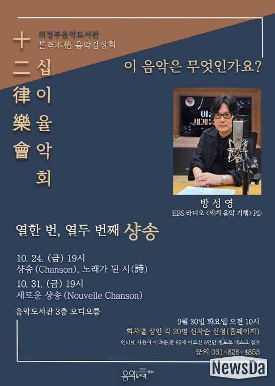 뉴스다 최광묵 기자 | 의정부음악도서관은 음악 전문가의 해설과 함께하는 음악감상회 ‘십이율악회(十二律樂會)’를 10월에도 운영한다.
