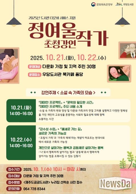 뉴스다 최광묵 기자 | 제주시 우당도서관은 2025년 도서관 다문화 서비스 지원 사업의 일환으로 ‘정여울 작가 초청 강연’을 오는 10월 21일과 22일 이틀간 북카페 퐁당에서 진행한다.