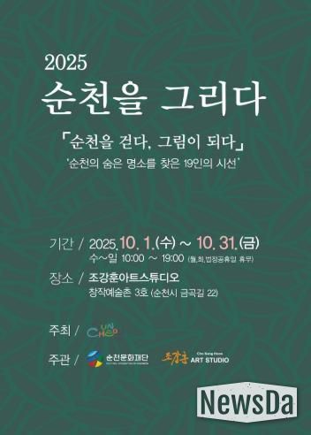 뉴스다 최광묵 기자 | 순천문화재단은 오는 10월 1일 오후 5시 개전식을 시작으로 10월 31일까지 순천창작예술촌 3호 조강훈 아트 스튜디오에서 「순천을 그리다 - 순천을 걷다, 그림이 되다」 전시를 개최한다.