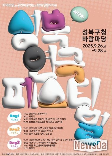 뉴스다 최광묵 기자 | 서울 성북구가 지역주민과 예술인이 함께 만드는 야외 연극축제 ‘제12회 성북 연극페스티벌’을 9월 26일부터 28일까지 3일간 성북구청 맞은편 바람마당에서 개최한다.