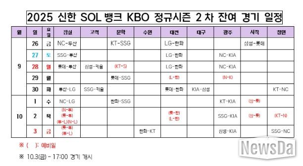 뉴스다 류대현 기자 | KBO는 26일(금) 2025 신한 SOL뱅크 KBO 정규시즌 2차 잔여 경기 일정을 확정했다.