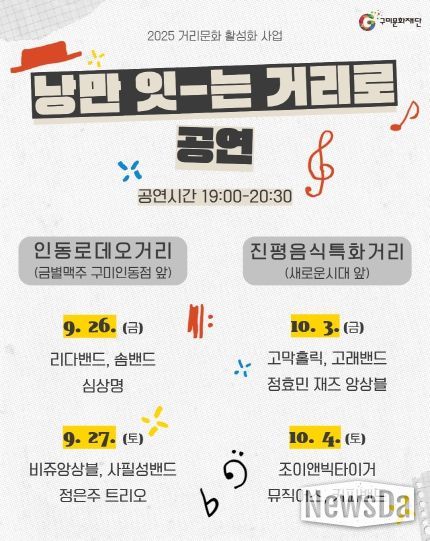 뉴스다 최광묵 기자 | 구미문화재단(대표이사 이한석)는 시민들이 일상 속에서 다양한 문화예술을 향유할 수 있도록 오는 9월부터 10월까지'거리문화 활성화 사업'의 일환으로 인동로데오거리‧진평음식특화거리 일대와 금오산 배꼽마당 야외공연장에서 특별 공연을 개최한다. 이번 사업은 거리와 야외공연장이라는 공간의 특성을 살려 수준 높은 공연을 제공하고 문화로 일상 속 활력을 촉진하고자 기획됐다.