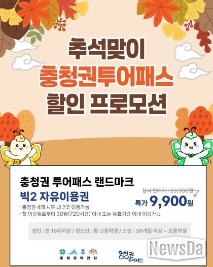 뉴스다 최광묵 기자 | 충청광역연합(연합장 김영환)은 민족 대명절 추석을 맞아 충청권 대표 관광상품 ‘충청권투어패스’의 특별 할인 프로모션을 진행한다고 밝혔다.