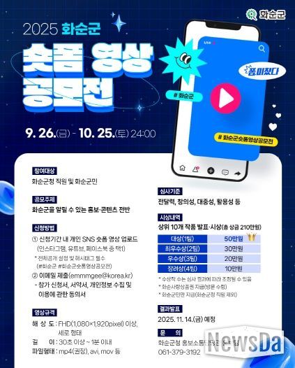 뉴스다 최광묵 기자 | 화순군은 26일 최신 영상 트렌드인 ‘숏폼(short-form)’을 활용해 군민과 공직자의 자발적인 참여를 유도하고, 지역 홍보 역량을 강화하고자 '2025 화순군 숏폼 영상 공모전'을 개최한다고 밝혔다.