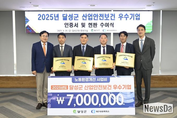달성군은 대구상공회의소와 공동으로 지난 26일 ‘2025년 달성군 산업안전보건 우수기업 인증서 및 현판 수여식’을 개최하고, 안전한 일터 만들기에 솔선수범한 관내 4개 기업에 인증서와 현판을 전달했다.