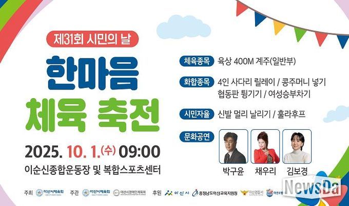 뉴스다 최광묵 기자 | 아산시는 오는 10월 1일 이순신종합운동장에서 ‘제31회 시민의 날 한마음 체육축전’을 개최한다.