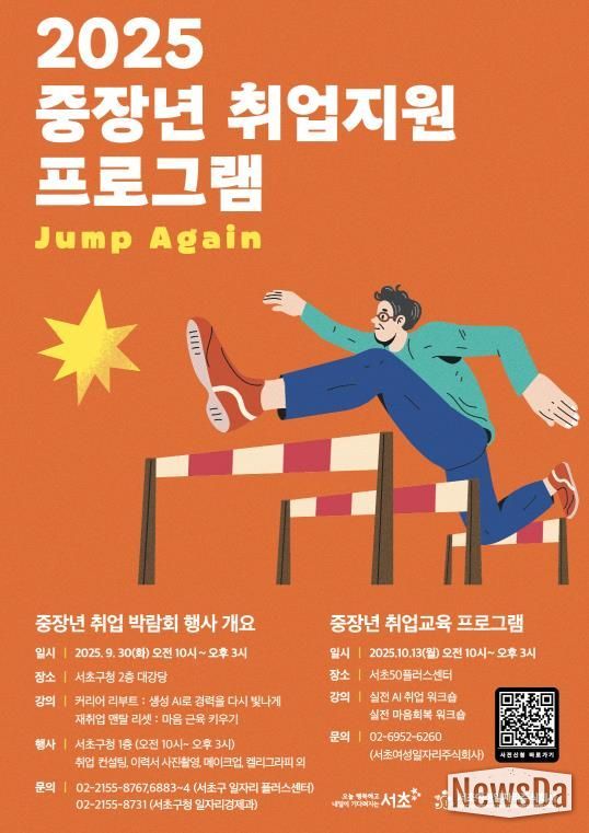 뉴스다 최광묵 기자 | 서울 서초구는 중장년의 구직 활동을 응원하기 위해 오는 30일 취업지원 프로그램 ‘점프 어게인(JUMP AGAIN)’을 개최한다고 밝혔다.